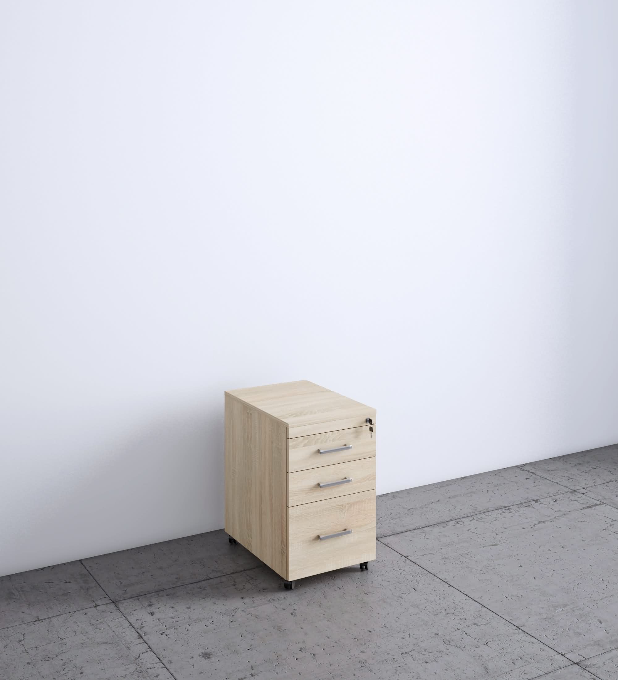 Zgodnie z wymogami normy E1 kontenery wykonane są z płyty wiórowej laminowanej w szerokiej kolorystyce lub z płyty MDF z wykończeniem fornirowanym, lakierowanym, pokrytym laminatem. Powierzchnie fornirowane są polakierowane.